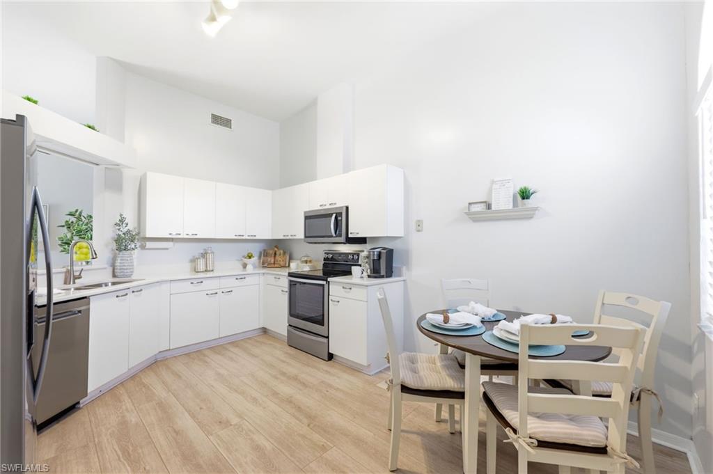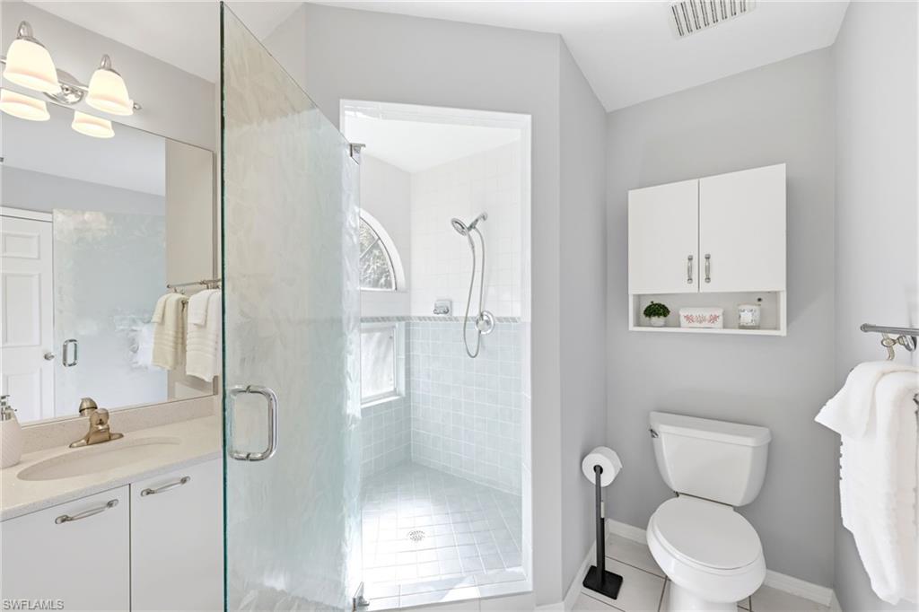 Lakeside is a premier gated community centered around a stunning 40-acre freshwater lake in the heart of North Naples, offering an exceptional lifestyle just minutes from the Gulf’s pristine white-sand beaches. This beautifully remodeled second-floor end-unit carriage home features three bedrooms, two baths, and nearly 1,600 square feet of thoughtfully designed living space. The light-filled interior showcases quartz countertops in both the kitchen and bathrooms, creating a clean, modern feel throughout. A private one-car attached garage with durable epoxy flooring adds both convenience and a polished finish. The spacious Master suite features a walk-in closet and a well-appointed en-suite bath with dual sinks and elegant quartz countertops. Step out onto the screened lanai to unwind and enjoy tranquil views of lush, mature landscaping—an ideal setting for morning coffee or relaxed evening dining. Perfectly situated just across from one of the community’s two pools, offering both convenience and resort-style living. This residence also benefits from access to highly rated A+ schools. Lakeside delivers a true resort-style experience, highlighted by two lighted lake fountains and opportunities for fishing and kayaking. Residents enjoy an impressive array of amenities, including two swimming pools, four Har-Tru tennis courts, pickleball, basketball, bocce, and shuffleboard. The two-story clubhouse features a fitness center, sauna, billiards room, and a full kitchen for private gatherings. A scenic 1.5-mile walking path winds throughout the beautifully landscaped grounds. Perfectly situated near award-winning dining, world-class golf, outdoor recreation, I-75, and upscale shopping, this residence presents an outstanding opportunity to enjoy the best of North Naples living.