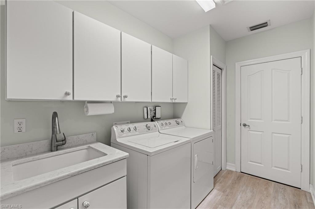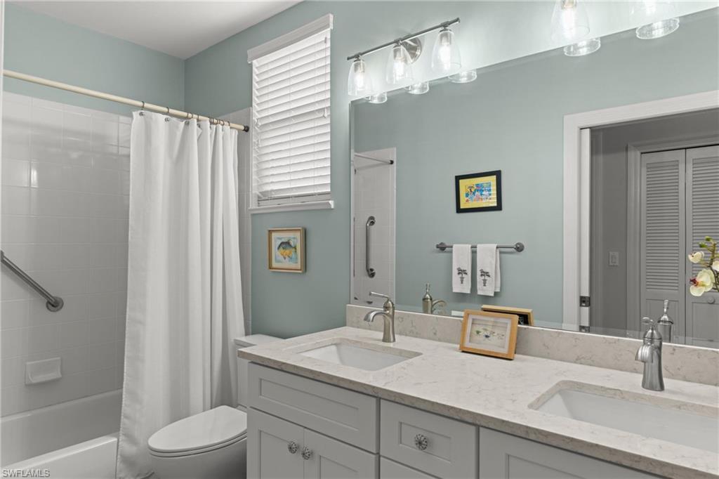 Completely remodeled plus a five-year new roof, this rare floor plan has a formal dining room which could be converted to other use. The kitchen has custom white shaker cabinets, quartz counter tops, tile back splash and Kitchen Aide premium appliances. The master bath and quest bath have similar cabinets plus the master has a great large open frameless glass shower plus glass block windows to enhance the daylight while providing privacy. The home has Luxury Vinyl flooring that looks like wood but is waterproof with low maintenance. There are crown moldings throughout, extra closets with shelving and storage racks in the garage. The large, covered Lanai offers great all-day shade and the paver decking on the Lanai and around the pool and spa which add to the overall appearance, enjoyment and wonderful lake view. The outdoor poolside shower is a plus as well. Pelican Landing amenities include gated security with guard, community center with lots of planned social activities, professional fitness center, 12 Har-Tru tennis courts, 7 Pickleball cts, Bocce. canoe/kayak center w/boats; marina w/docks, sailing center w/boats, butterfly garden, children play park and a 34-acre beach island on the Gulf of Mexico serviced by Pelican Landing shuttle boats across Estero Bay all year long. Optional memberships (subject to availability) at The Nest Golf Club. A Tom Fazio designed 36-hole golfers delight with a fabulous, remodeled clubhouse offering both casual and fine dining. Pelican Landing is only five minutes to the amazing Coconut Point Mall, 20 minutes to RSW Airport and a short drive to dozens of restaruants. .