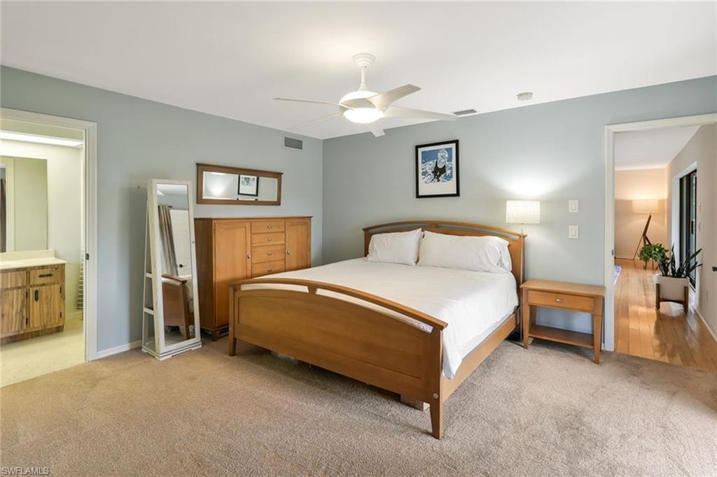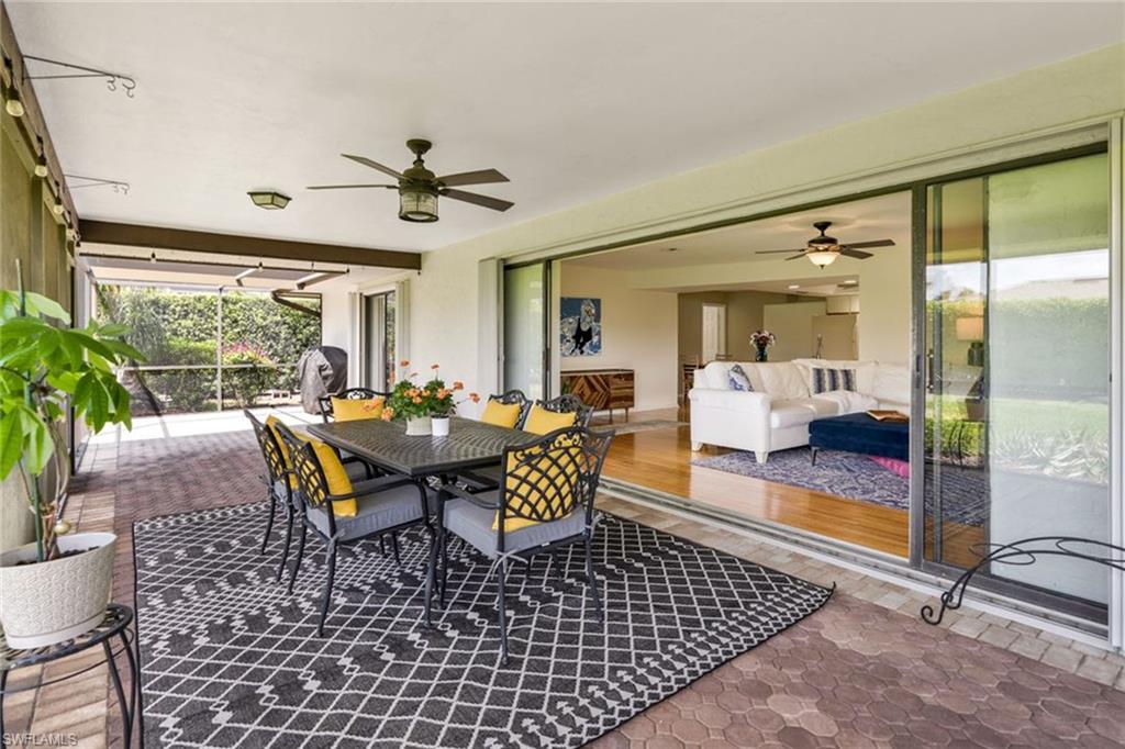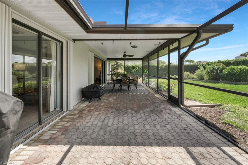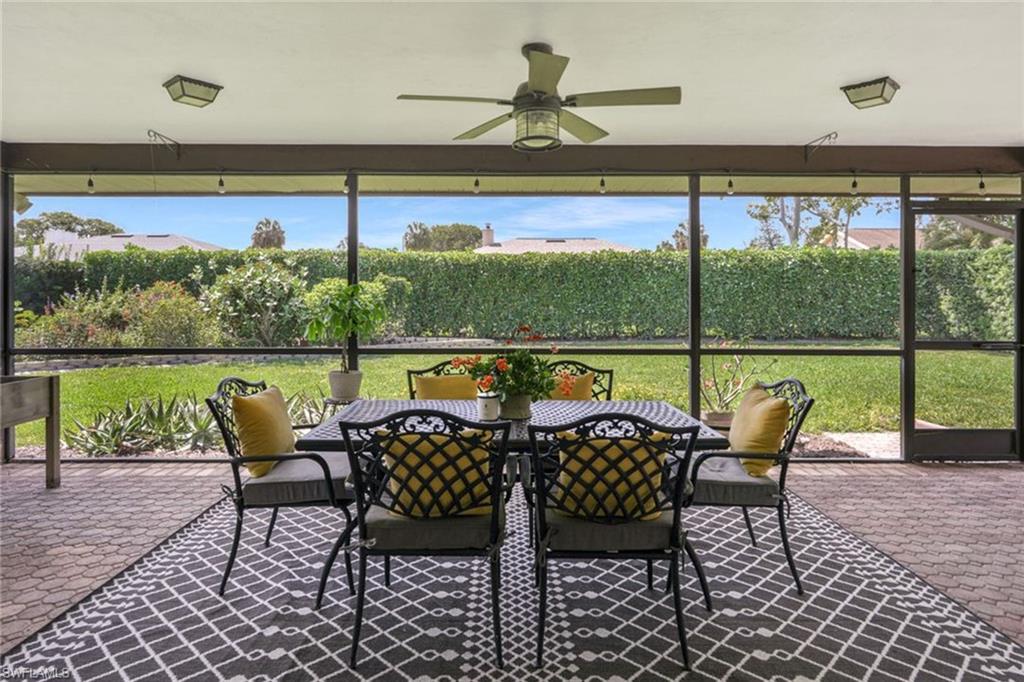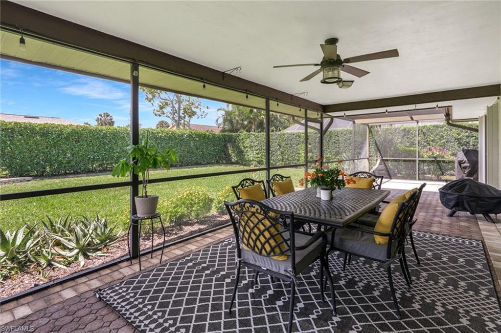 An exceptional opportunity within the coveted Victoria Park community of North Naples, this spacious three-bedroom, two-bath residence blends convenience and effortless Florida living. Privately situated on a quiet interior street with a southern exposure, the home showcases over 2,000 square feet of interior space designed for both comfort and enjoyment. A double-door front entry introduces a light-filled, thoughtfully curated interior where living areas flow seamlessly throughout multiple living spaces, creating an ideal setting for both family gatherings and entertaining. The split-bedroom floor plan enhances privacy, with a primary suite offering convenient direct access to the screen enclosed lanai for easy indoor-outdoor lifestyle. At the heart of the home, the kitchen features generous storage, an oversized pantry, and a charming breakfast nook, while the separate formal dining space sets the stage for memorable hosting. The living room sliding glass doors invite natural light to pour in, framing picturesque garden views and enhancing the home’s tranquil ambiance. The screened lanai is a private sanctuary, overlooking lush, manicured landscaping, offering a peaceful backdrop for morning coffee or sunset unwinding. Additional enhancements include updated windows, a beautifully renovated guest bath, and a spacious laundry room with custom storage and folding space, plus manual and accordion storm shutter for peace of mind. The home’s striking curb appeal is defined by a paver driveway, expansive front lawn, and a two-car garage. Victoria Park residents enjoy an array of lifestyle amenities including a resort-style pool, tennis and basketball courts, and a scenic fishing pier. Perfectly positioned within an A-rated school district and just moments from upscale shopping, fine dining, and the white-sand beaches, this residence embodies the best of North Naples living.