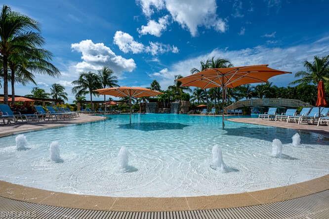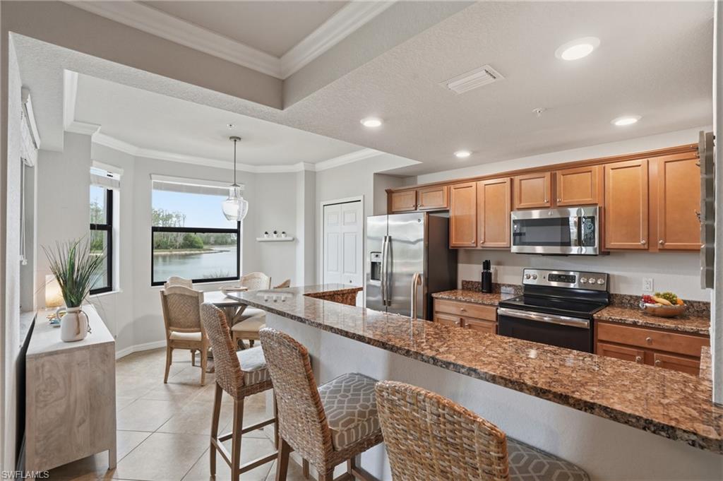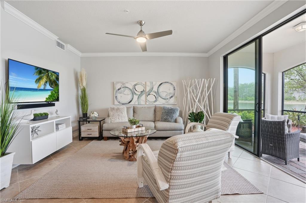 Wake up to sunlit lake views in this south-facing first-floor residence, where natural light and a peaceful waterfront setting define the living experience. The rear lanai overlooks the lake, offering a bright and inviting backdrop throughout the day and a warm, tranquil ambiance as the sun moves across the southern sky. Inside, the open-concept floor plan is designed for both comfort and functionality. The kitchen, dining, and living areas flow seamlessly together, with sliding glass doors extending the space to the screened lanai. This residence enjoys an exceptional location within Treviso Bay, just a short distance from both the community-wide pickleball courts and the Trevi satellite amenity area--widely regarded as the most complete and well-appointed satellite amenity offering in the community. Perfectly positioned, it provides convenient access for everyday enjoyment while remaining far enough removed to preserve a quiet and peaceful living environment. The Trevi satellite amenity area features an L-shaped resort-style pool with dedicated lap lanes, multiple swimming areas, and an expansive sun deck designed for lounging and relaxation. It is further complemented by a trellised circular outdoor pavilion, thoughtfully appointed with two gas grills and a Big Green Egg--ideal for elevated outdoor cooking and entertaining. Treviso Bay offers a true resort lifestyle with a recreation center featuring a waterfall pool with lap lanes, a poolside restaurant and bar, sandy lakeside beach with hammocks, a full-service spa/salon, a state-of-the-art fitness center, and more. The 64,000-square-foot clubhouse provides dining, social spaces, and luxury amenities, while the private TPC golf course is available to social members on a pay-to-play basis during the off-season. Widely regarded as one of Naples' most beautifully landscaped communities, Treviso Bay features lush palms, scenic walkways, a boardwalk leading to a lakeside viewing pavilion, and multiple fountains--creating a refined, coastal, and relaxing resort-inspired setting. Offered turnkey furnished and tastefully updated, this residence is move-in ready and ideal for full-time living, seasonal use, or investment.