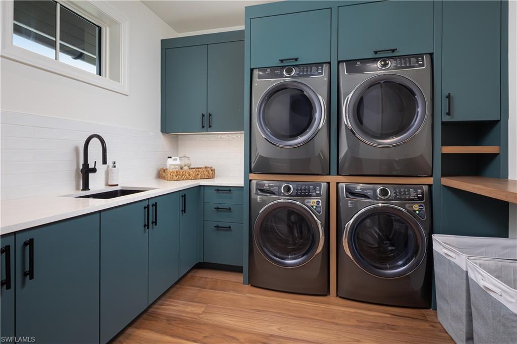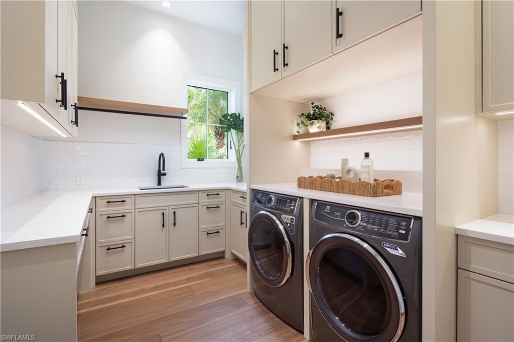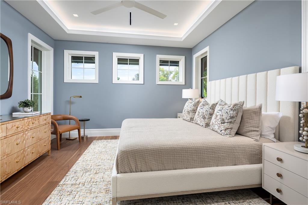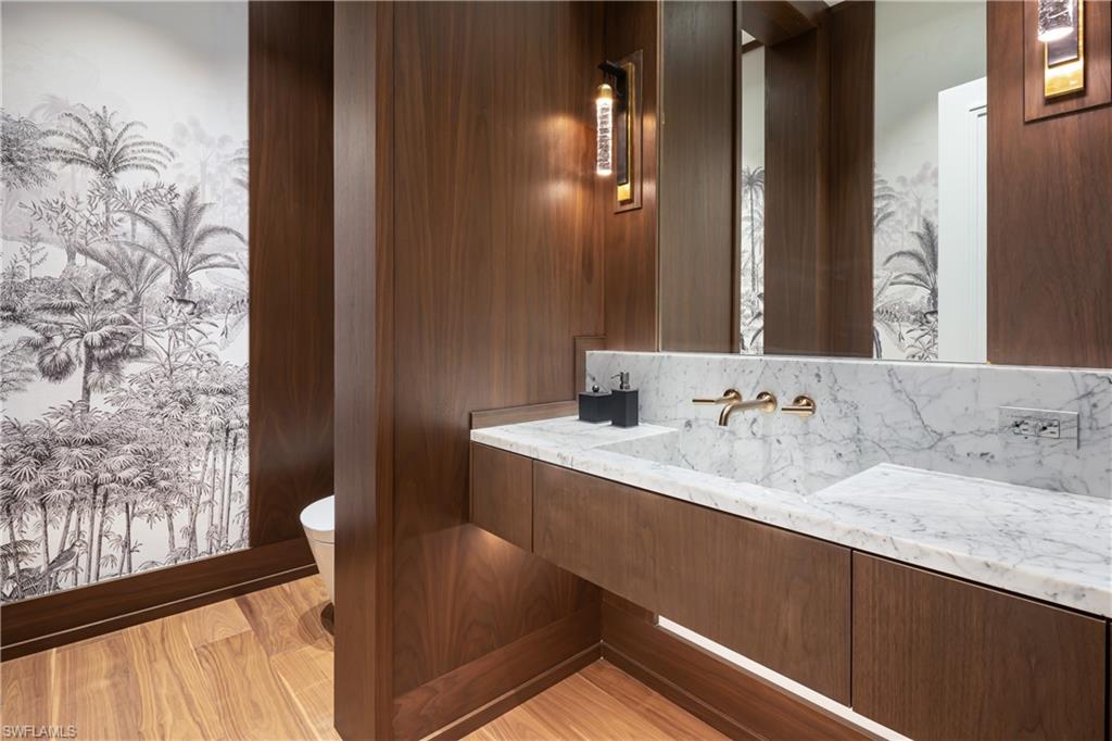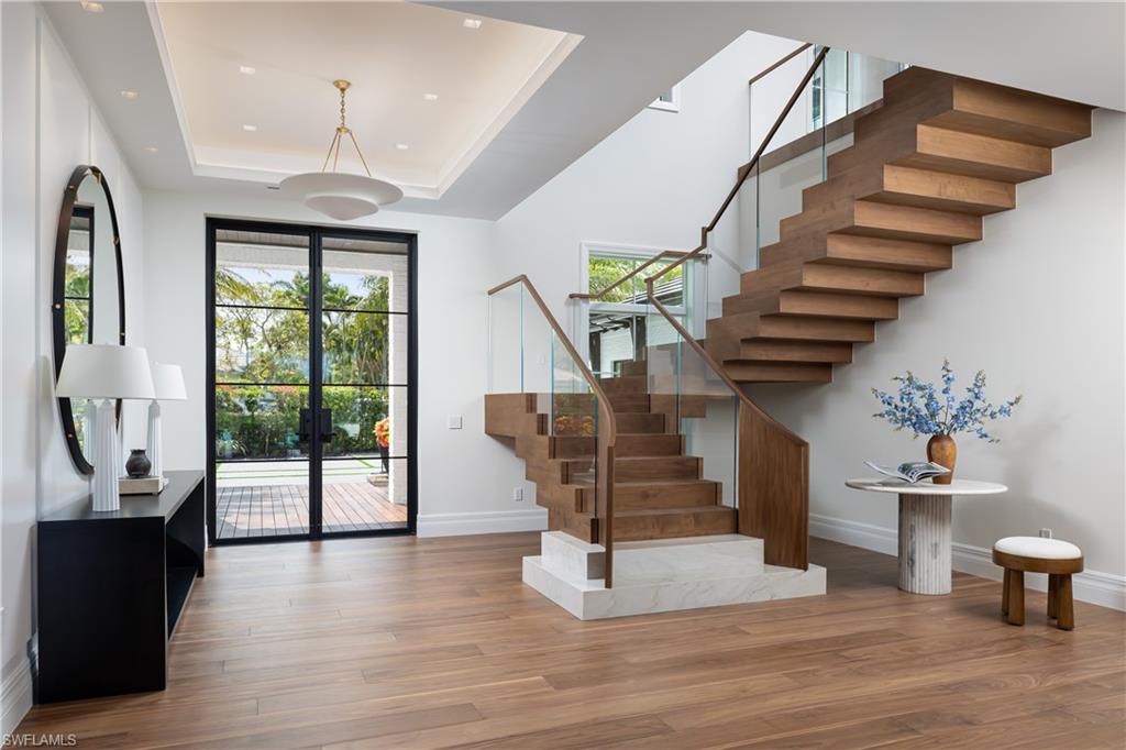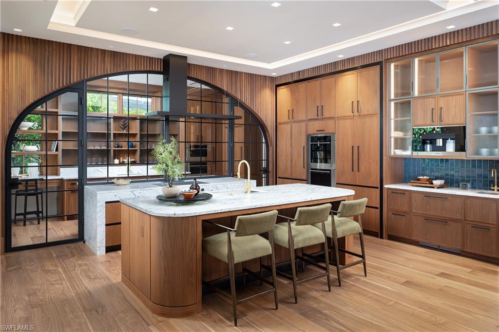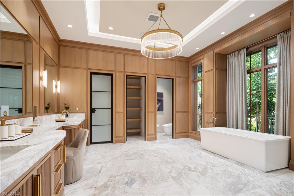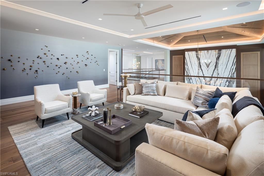 NOW COMPLETE! Commanding a rare, western lakefront view in Old Naples, this new construction estate redefines scale, craftsmanship, and architectural clarity. Encompassing over 9,400 square feet of interior living space, the home was conceived as a private resort - where every element supports both the grand and granular aspects of daily living. Twin infinity-edge reflecting pools frame the entrance, opening into a dramatic two-story great room with precision millwork, architectural symmetry, and a sculptural floating staircase. Adjacent, a formal dining room is anchored by a custom, glass-enclosed wine wall integrated into bespoke cabinetry. The kitchen, defined by a curved steel-and-glass partition, includes Wolf/Sub-Zero appliances, dual Miele coffee stations, and a concealed butler’s pantry equipped for large-scale entertaining. Subtle finishes and architectural restraint elevate the overall atmosphere. The first-floor primary suite is entirely self-contained, featuring a private study, two oversized dressing rooms, a discreet laundry center, and a marble-clad bath with indoor/outdoor showers. Upstairs, five additional bedroom suites are complemented by a media lounge and a concealed club room with full bar and humidor. Outdoor architecture is equally refined. A 60-foot negative-edge pool extends across the rear elevation, interrupted by a series of stepping-stones that lead to a sunken firepit lounge surrounded by water. An elevated spa, covered loggia, and summer kitchen complete the space. Above it all, a detached fitness pavilion with breath-taking wide lake vistas, introducing a compelling architectural counterpoint. Additional features include 13x Toto Neorest toilets, three laundry stations, a commercial-grade sheet ironer, full-home generator, elevator, and a five-car split garage designed for collectors. A comprehensive smart home system governs all functions discreetly. Realized by New England based developer EMB Custom Homes, and executed by MHK Architecture, Lotus Construction, and Freestyle Interiors, this fully furnished residence is a singular opportunity in the Naples luxury market.