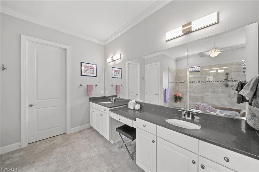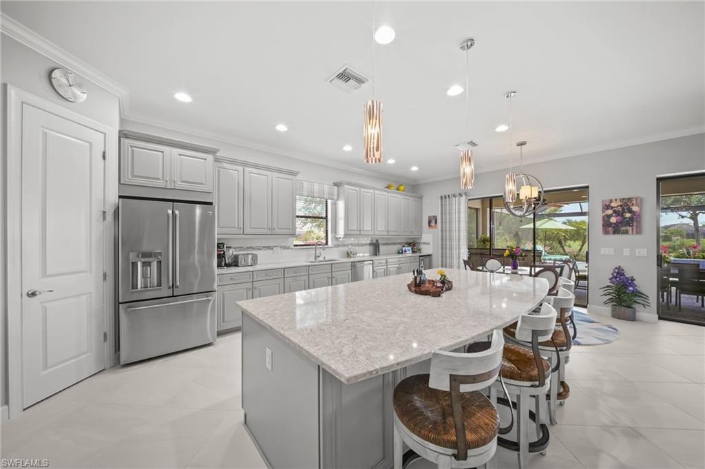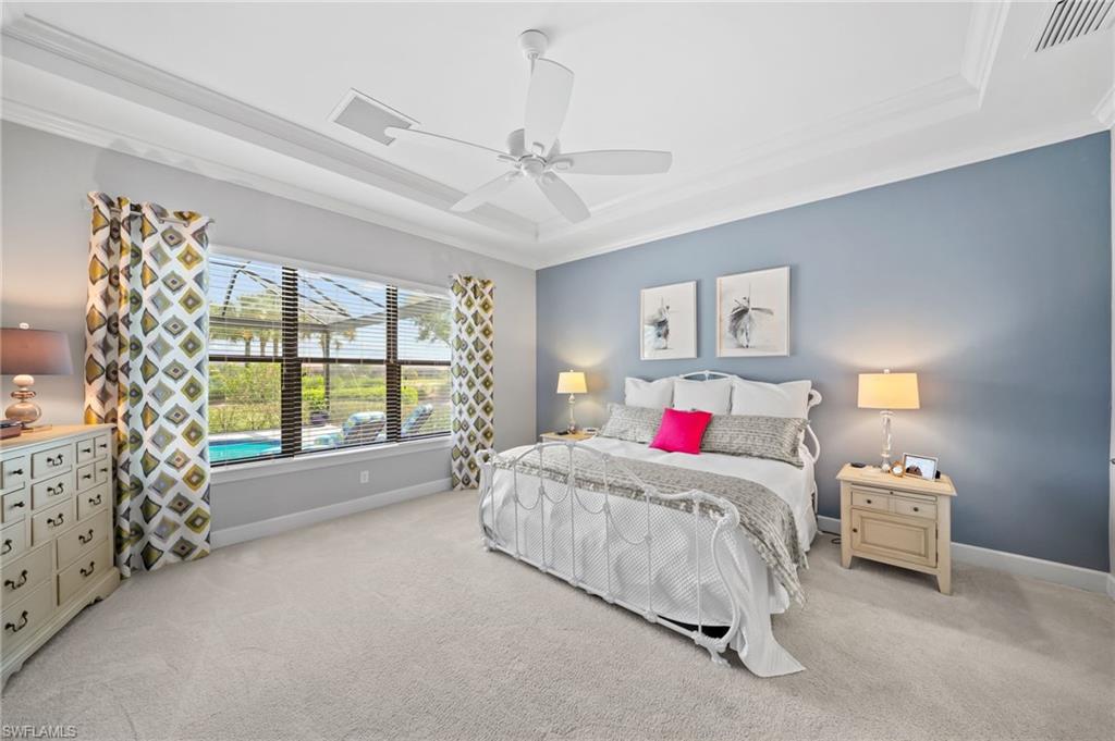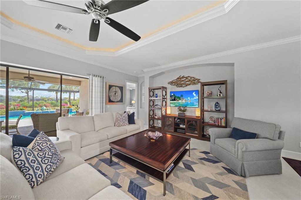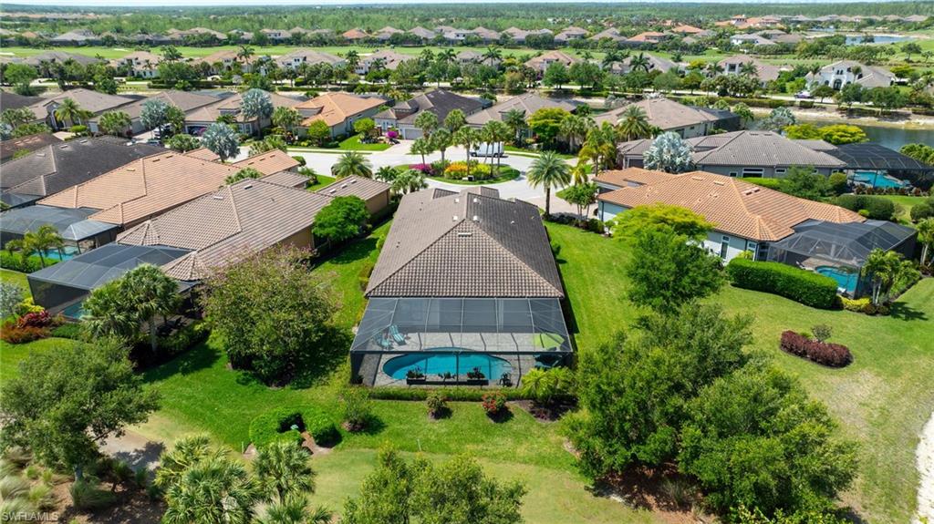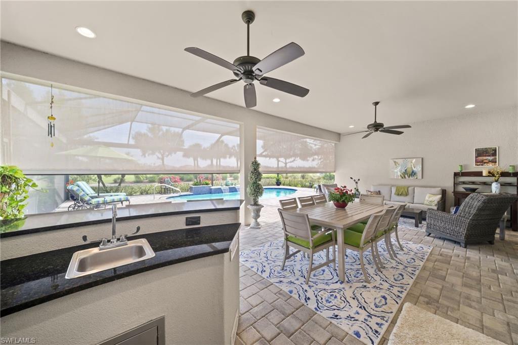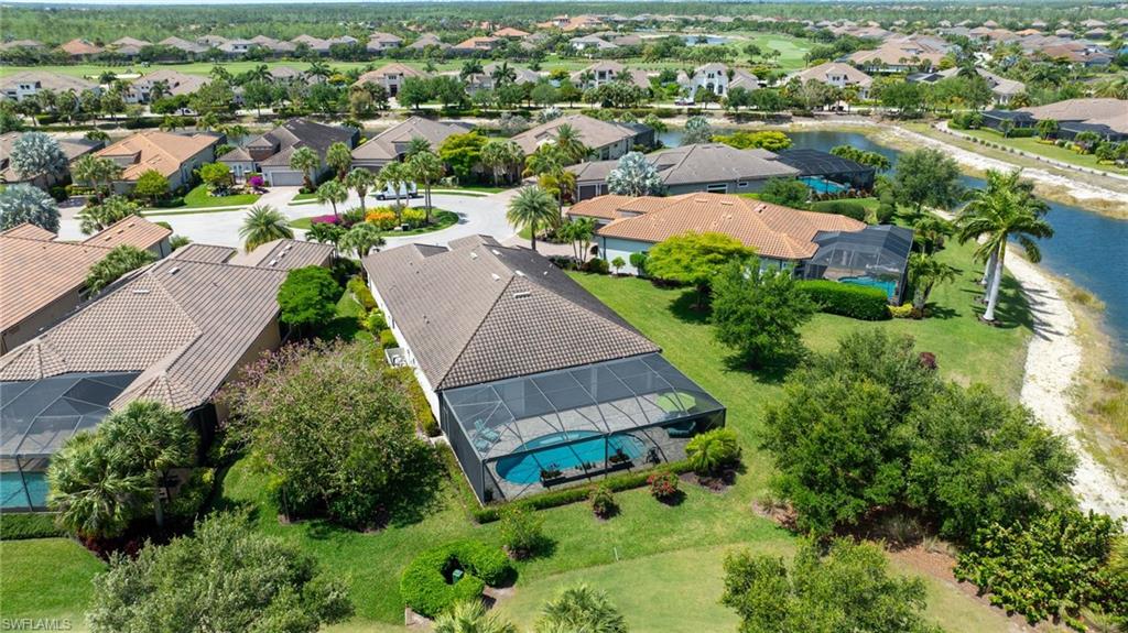 FULL GOLF MEMBERSHIP INCLUDED! A LOT to Love! This highly sought after “Palazzio” model is situated on a premium oversized (nearly half an acre/.39) pie shaped lot at the end of a quiet cul-de-sac street with expansive views of two lakes and the 14th green. The spacious floorplan features 3 Bedrooms plus Den, 3 full bathrooms, and nearly 3,100 sq ft of air conditioned living space accompanied by an oversized 550 sq ft covered lanai. With oversized rooms throughout, the open great room floorplan creates a seamless flow for entertaining and comfortable living. Two sets of pocketing sliding glass doors invite you to the expanded lanai, where you can enjoy picturesque lake and golf course views, making this outdoor space an absolute retreat. The private pool area boasts a gas-heated pool with two waterfalls. For those who love outdoor living, the lanai is equipped with an outdoor kitchen and can be enclosed by electric motorized roll-down hurricane screens, ensuring year-round enjoyment. Inside, oversized 24”x24” porcelain tile floors flow throughout the common areas. The expanded kitchen features an abundance of raised-panel cabinetry, Cambria quartz countertops, a stylish tile backsplash, and top-of-the-line GE Café appliances, including a GAS range. Additional luxury finishes include: impact glass double front doors with matching sidelights; tandem style 3 car garage; expanded front guest bedroom with bay window; built-in cabinetry and desk in the den; special order lights/chandeliers; crown molding throughout; tankless GAS hot water heater; and more! This home is being offered FULLY FURNISHED so one can start enjoying the Esplanade lifestyle immediately without any inconvenience! Esplanade Golf & Country Club of North Naples offers a true “Lifestyle Community” with world-class amenities, including a resort pool with cabanas and the popular “Bahama Bar,” tennis, pickleball, bocce, a 14-mile network of bike/walking trails, and an 18-hole private golf course. The impressive 15,000 Sq Ft clubhouse features a restaurant, bar, wine-tasting room, wine lockers, and a Starbucks-style café. Best of all, the property’s landscaping, irrigation, golf membership, and all community amenities are covered under a quarterly fee of just $3,768—no additional fees or memberships required! Don't miss your opportunity to own this exceptional home in one of Naples’ most sought-after communities. Schedule your tour of this stunning home and Esplanade Golf & Country Club today! NON FLOOD ZONE/NO FLOOD INSURANCE REQUIRED/ZONE X!